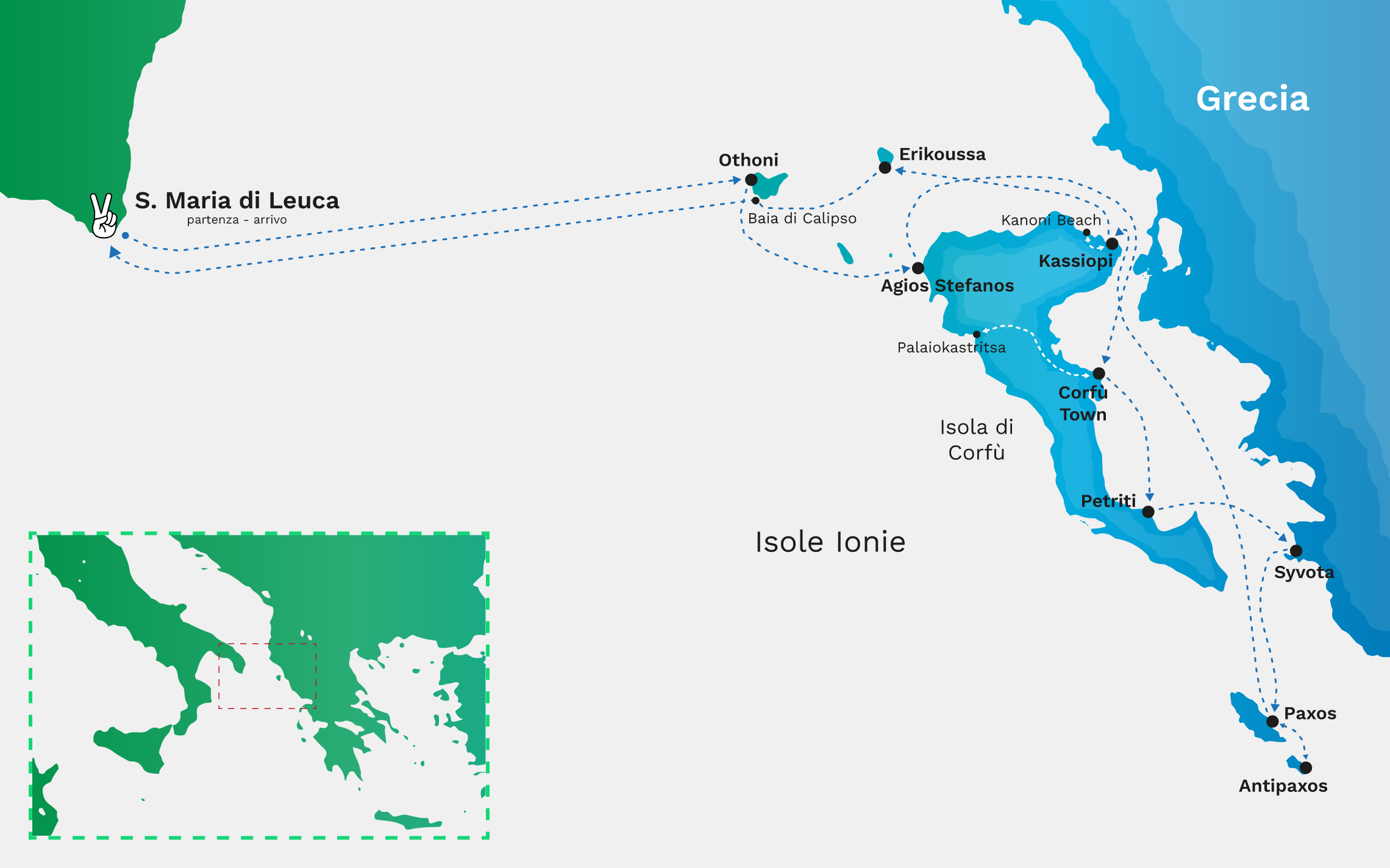 Con partenza da Leuca l'itinerario di massima prevede il tour delle isole Diapontie, di Corfù fino a Paxos, Antipaxos e posti limitrofi. Non sono previste partenze durante la notte. Le partenze, meteo permettendo, sono la mattina subito dopo l'alba. L'itinerario può comunque essere concordato anche direttamente a bordo, di comune accordo con lo skipper. Le condizioni meteo-marine possono condizionare gli orari e l'itnerario. L'itinerario può essere modificato da scelte insindacabili dello skipper in base alle condizioni meteo e alla sicurezza del viaggio stesso.